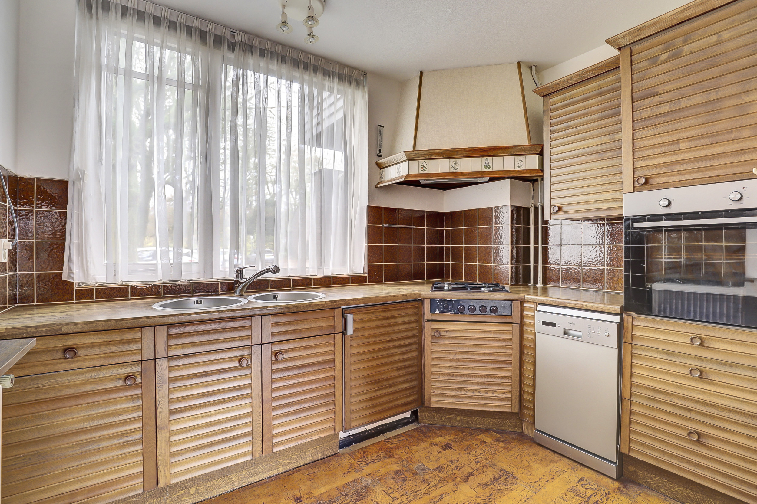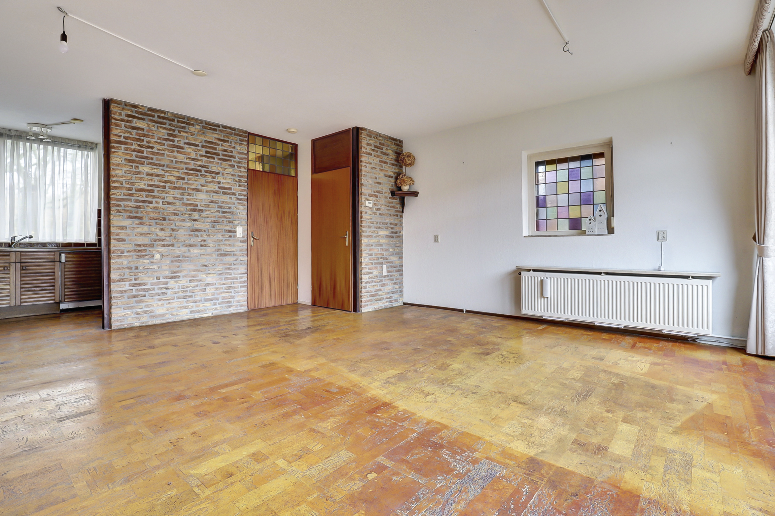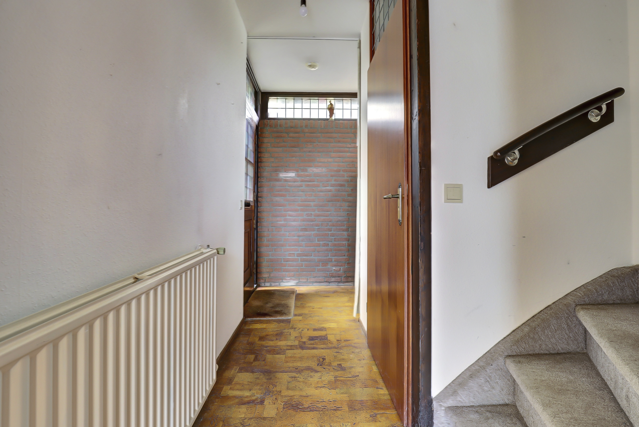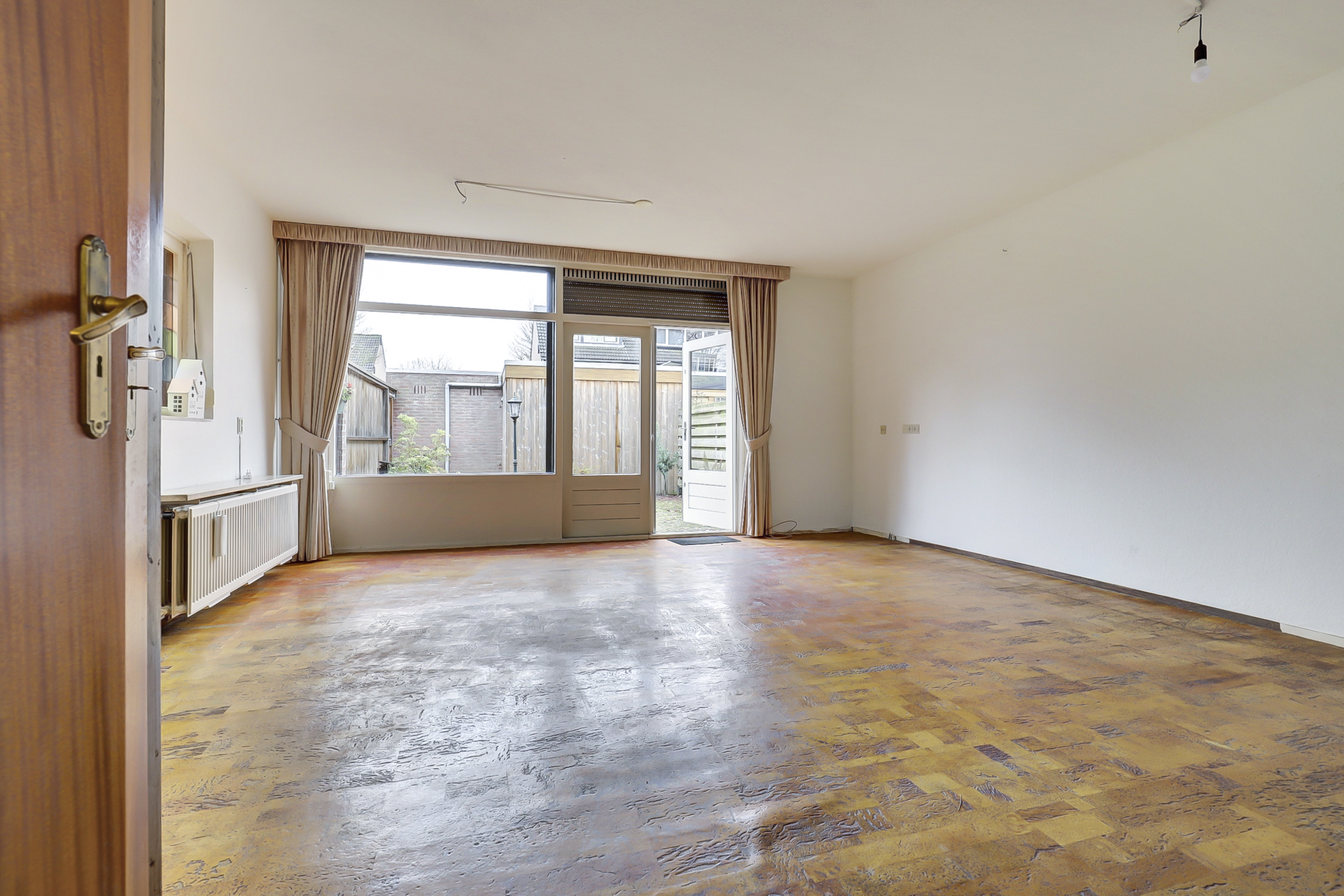 Bij aankomst van de woning wordt je verwelkomd door een voordeur met glas-in-lood. Stap binnen in de ruime hal waar je ruimte hebt voor het ophangen van jassen. Hier bevindt zich ook de meterkast, het toilet met fontein en de vaste trap naar de eerste verdieping. De woonkamer ligt aan de tuinzijde en heeft veel natuurlijk licht dankzij de grote raampartijen. Daarnaast is er een praktische trapkast en zijn er elektrische rolluiken. Vanuit de woonkamer is er direct toegang tot de tuin, waardoor binnen en buiten makkelijk in elkaar overlopen. Aan de voorzijde ligt de halfopen L-vormige keuken: een functionele werkruimte met inbouwapparatuur, oven (2016), 4-pits gasfornuis, vaatwasser, koelkast (2016) en een raam met uitzicht naar buiten en elektrisch rolluik.